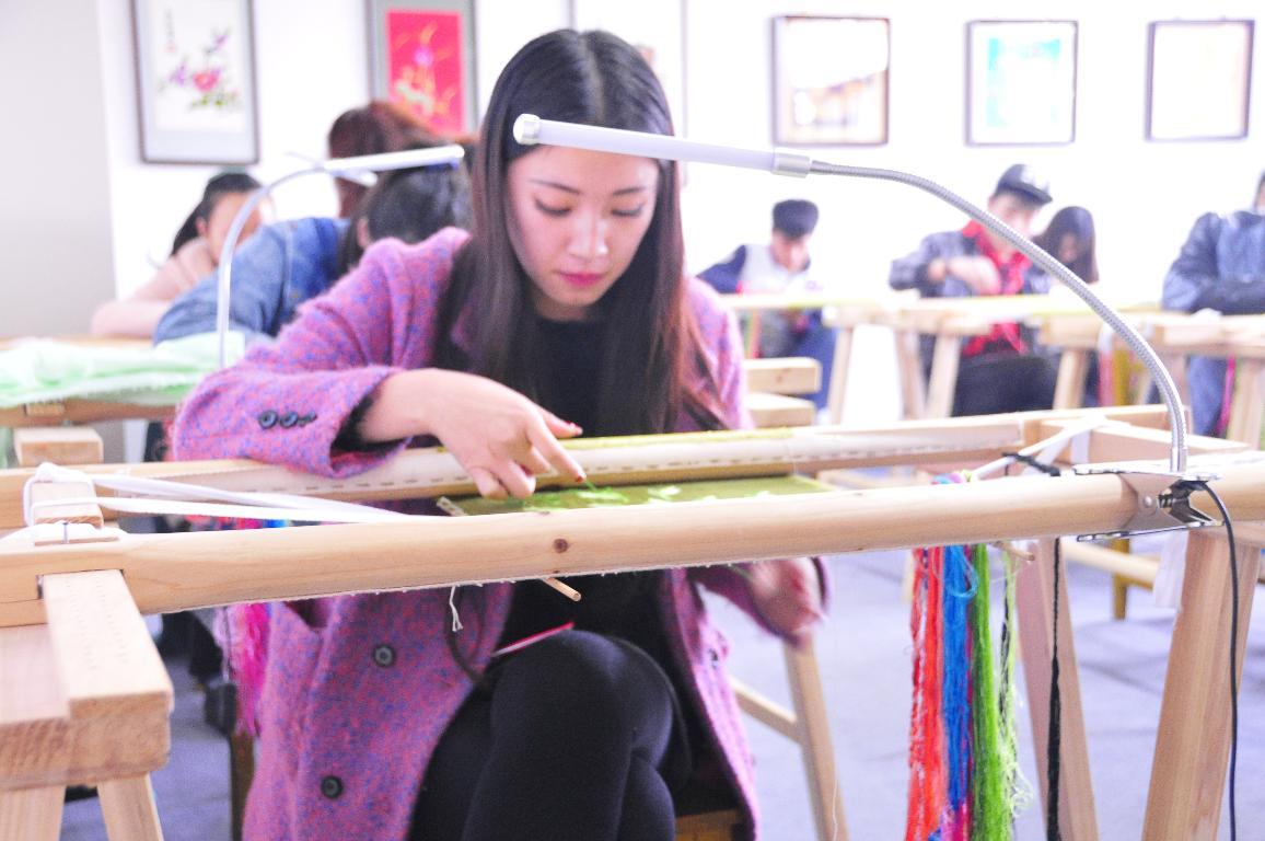 一幅幅古色古香的绣品悬挂在墙上,19名穿着现代服装的老员工端坐在绣架前,绕线、扎针绣花蕊。这是我系汉绣坊汉绣技能课的一幕情景。这些员工均为“90后”,是我省首批汉绣老员工,进校前从未摸过针线活,经过半年多的学习,已能熟练地飞针走线了。