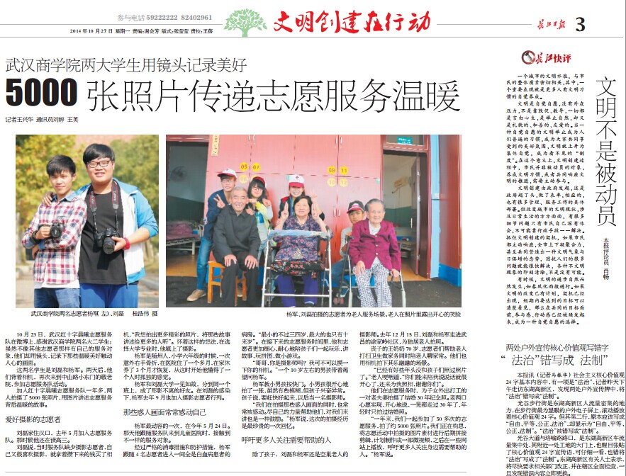 长江日报讯 10月23日,武汉红十字晨曦志愿服务队在微博上,感谢太阳成集团122cc官网入口两名大二员工:虽然不像其他志愿者那样有自己的服务对象,他们却用镜头,记录下那些温暖美好触动人心的画面。